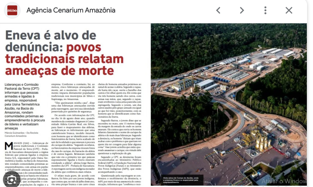 A REVISTA CENARIUM AMAZÔNIA publicou, em sua versão impressa de outubro, a denúncia de lideranças de povos tradicionais, junto à Comissão Pastoral da Terra – Prelazia de Itacoatiara (CPT), na qual aponta que pessoas ligadas à empresa Eneva S/A, responsável pela Usina Termelétrica Azulão, na Bacia do Amazonas, assediam comunidades próximas ao empreendimento, com armas em punho e ameaças de morte.