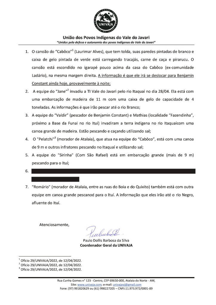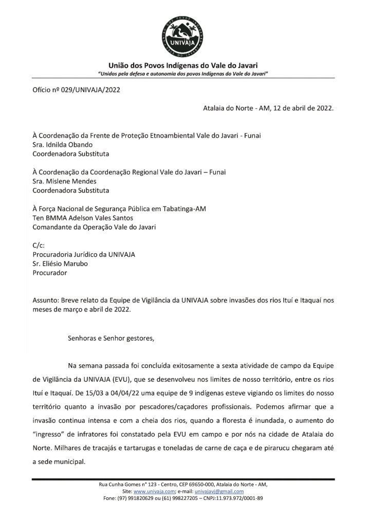 Além dos documentos datados do mês de abril, outros cinco ofícios também foram formulados pela União dos Povos Indígenas Vale do Javari (Univaja) e destinados a órgãos como Polícia Federal, Fundação Nacional do Índio (Funai), Força Nacional de Segurança Pública (FNSP) e ao Ministério Público Federal do Amazonas (MPF-AM).