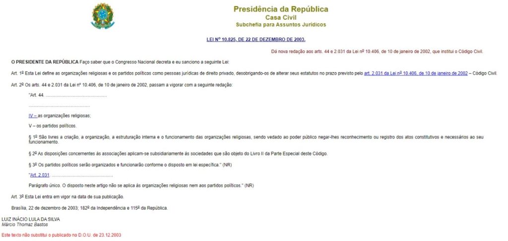 A primeira lei foi assinada pelo petista em 2003, no seu primeiro mandato, e garantiu aos cristãos a liberdade de criar templos, definindo, ainda, as organizações religiosas e os partidos políticos como pessoas jurídicas de direito privado.