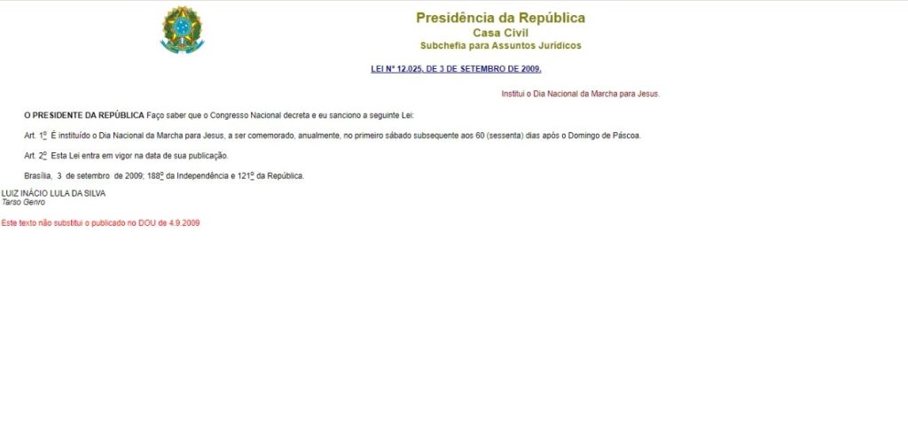 A segunda determinou, em 2009, que o Dia Nacional da Marcha para Jesus seja comemorado, anualmente, no primeiro sábado subsequente aos 60 dias após o Domingo de Páscoa e a última, também assinada por Lula, mas no ano seguinte, instituiu o Dia Nacional do Evangélico, a ser comemorado em 30 de novembro de cada ano.