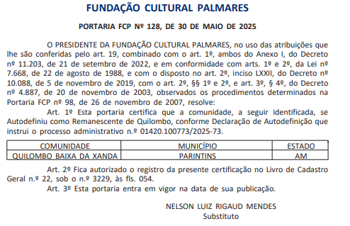 “Esta portaria certifica que a comunidade, a seguir identificada, se autodefiniu como remanescente de quilombo, conforme Declaração de Autodefinição, que institui o processo administrativo N° 01420.100773/2025-73“, consta no texto da portaria.