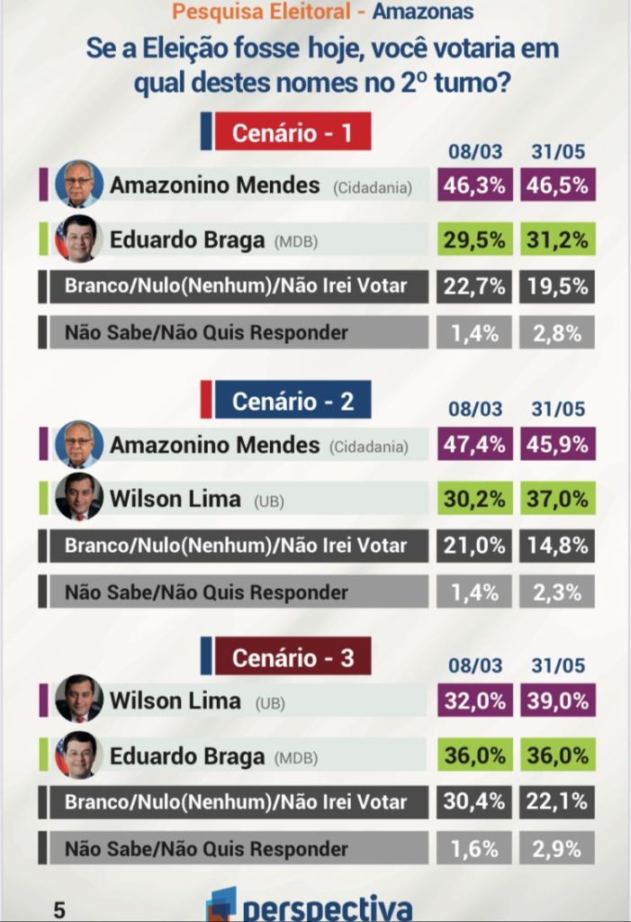 Se o segundo turno fosse com Wilson Lima e Eduardo Braga, o governador seria reeleito. De acordo com a Perspectiva, o governador registraria 39,0% das intenções de voto contra 36% do senador. A porcentagem representa um crescimento para Lima de 7 pontos percentuais, com relação à pesquisa anterior, enquanto Braga se mantém estável. Se a disputa no segundo turno fosse entre Amazonino e Eduardo, o resultado seria com o senador perdendo: Mendes teria 46,5% contra 31,2% de Braga.