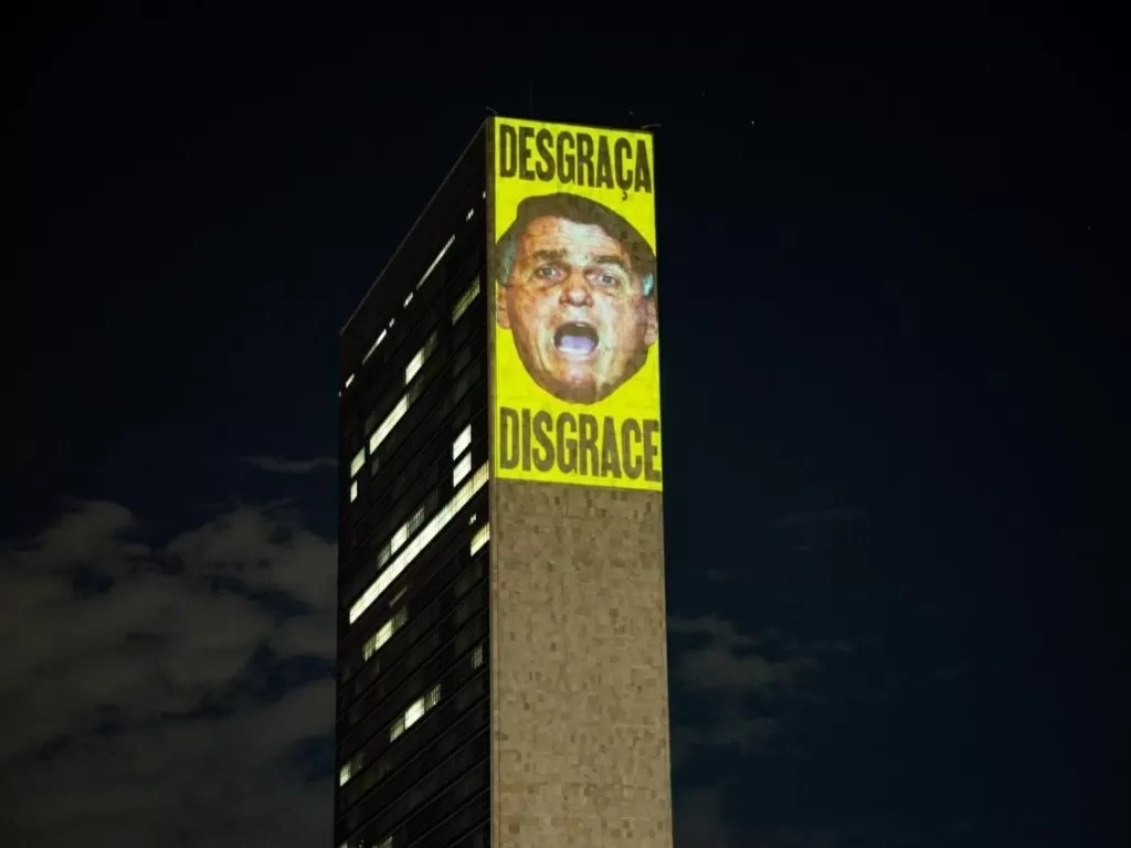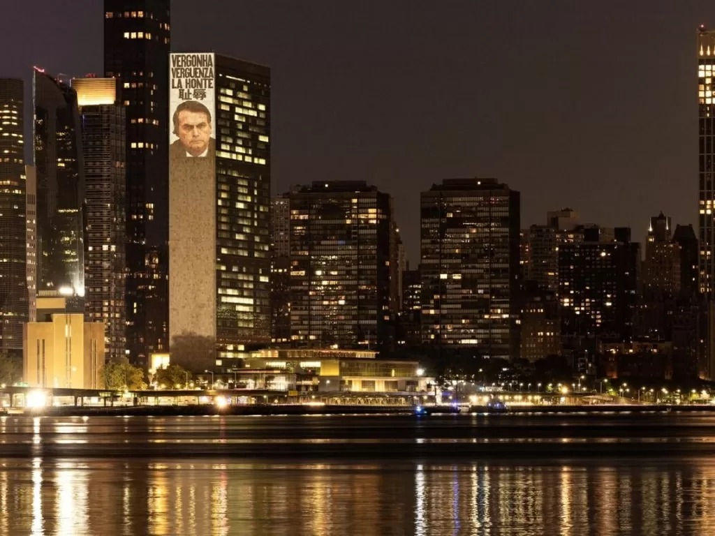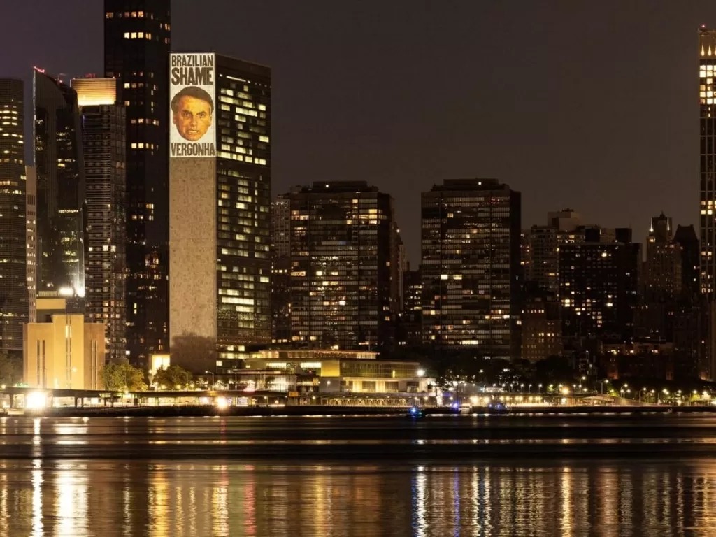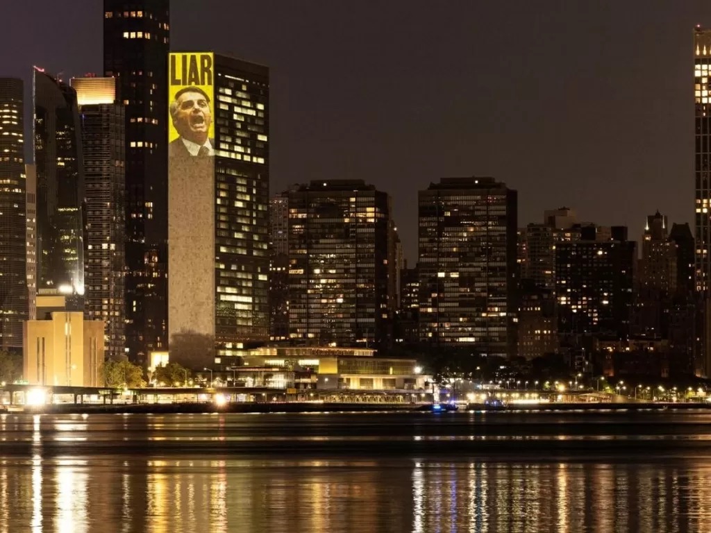 Durante a noite, o prédio da ONU foi iluminado com uma megaprojeção com a imagem do presidente brasileiro, e palavras como “vergonha brasileira”, “desgraça” e “mentiroso”. Os termos foram projetados em português e inglês e o ato foi realizado de maneira anônima.