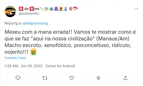 Amiga de Ruivinha de Marte, a manauara Yona Branches declarou que ficou desconfortável enquanto assistia às falas de Vini. “Um cara branco, de olhos azuis, brota com uma fala completamente xenofóbica em rede nacional dizendo que Manaus não é civilização, é muito desrespeitoso“, afirma.