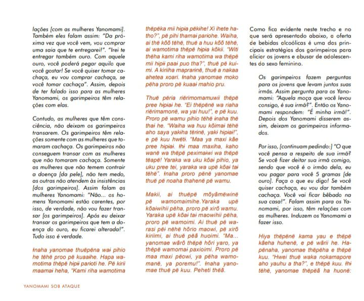 “(…) Eles também entregam para as mulheres perfumes para fazer com que elas se perfumem. Eles dizem [para elas] “Você ande somente depois de se perfumar com este!”. Assim fazem os garimpeiros quando querem ter relações [com as mulheres Yanomamis].
