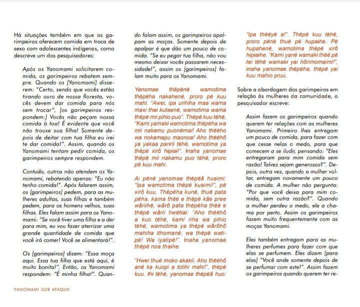 “Após os Yanomami solicitarem comida, os garimpeiros rebatem sempre. Quando os [Yanomami] disserem: “Certo, sendo que vocês estão tirando ouro de nossa floresta, vocês devem dar comida para nós sem trocar”, [os garimpeiros respondem:] Vocês não peçam nossa comida à toa! É evidente que você não trouxe sua filha! Somente depois de deitar com tua filha eu irei te dar comida!”. Assim, quando os Yanomami tentam pedir comida, os garimpeiros sempre respondem.