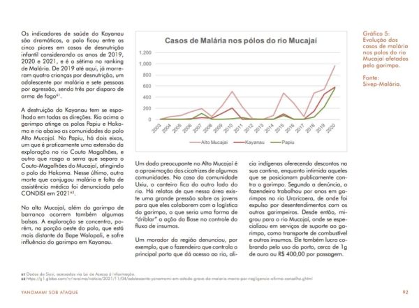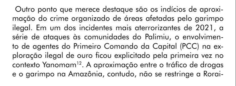 Outro ponto que merece destaque são os indícios de aproximação do crime organizado de áreas afetadas pelo garimpo ilegal. Em um dos incidentes mais aterrorizantes de 2021, a série de ataques às comunidades do Palimiu, o envolvimento de agentes do Primeiro Comando da Capital (PCC), na exploração ilegal de ouro, ficou explicitado pela primeira vez no contexto Yanomami. A aproximação entre o tráfico de drogas e o garimpo na Amazônia, contudo, não se restringe a Roraima. Em diversas outras regiões, como o Pará e o Mato Grosso, aquilo que alguns têm chamado de narcogarimpo 13 tem sido o comportamento padrão.