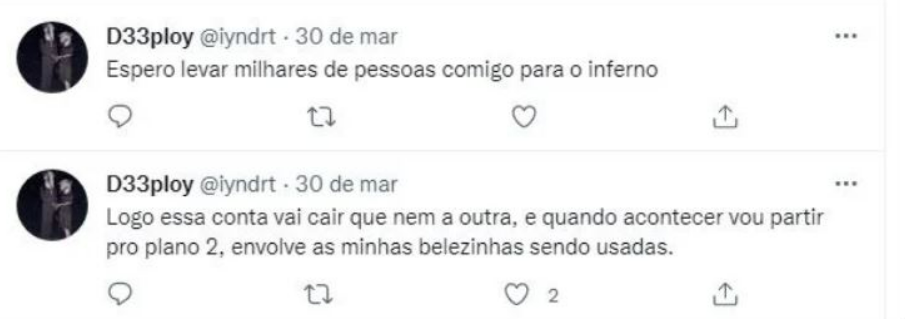“Espero levar milhares de pessoas comigo para o inferno”, escreveu o autor do perfil em uma das postagens, indicando a possibilidade de cometer suicídio após realizar o suposto massacre.