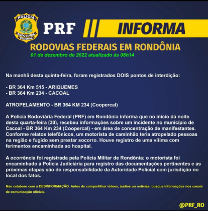Rondônia é um dos Estados que ainda registra bloqueio nas rodovias federais de manifestantes insatisfeitos com o resultado da eleição que elegeu Luiz Inácio Lula da Silva (PT) à Presidência. Nesta quinta-feira, a PRF afirma que são dois pontos interditados no Estado. O primeiro é no KM 515, da BR 364, e o segundo é no KM 234 da mesma rodovia, trecho onde ocorreu o acidente.