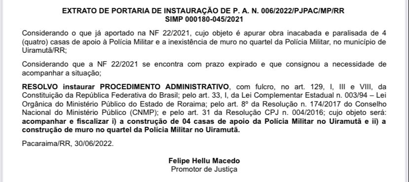 “Resolvo instaurar procedimento administrativo, com fulcro, no art. 129, I, III e VIII, da Constituição da República Federativa do Brasil; pelo art. 33, I, da Lei Complementar Estadual n. 003/94 – Lei Orgânica do Ministério Público do Estado de Roraima; pelo art. 8º da Resolução n. 174/2017 do Conselho Nacional do Ministério Público (CNMP); e pelo art. 31 da Resolução CPJ n. 004/2016; cujo objeto será: acompanhar e fiscalizar i) a construção de 04 casas de apoio da Polícia Militar no Uiramutã e ii) a construção de muro no quartel da Polícia Militar no Uiramutã”, finaliza o documento.