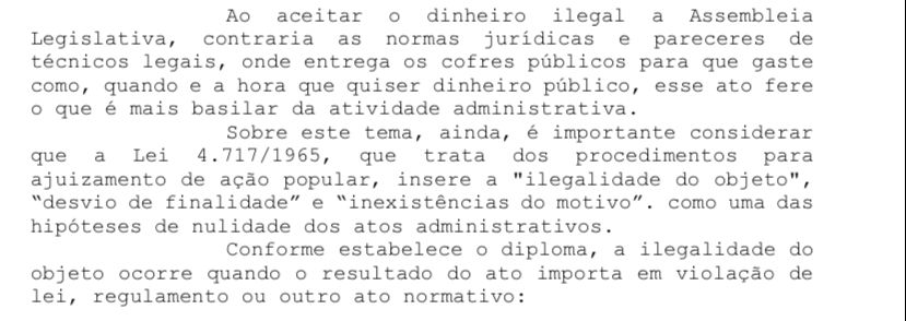 Neste trecho, o advogado aponta que ao aceitar o dinheiro ilegal a Assembleia Legislativa contraria as normas jurídicas e pareceres de técnicos legais, onde entrega os cofres públicos para que gaste como, quando e a hora que quiser o dinheiro público. Esse ato fere o que é mais basilar da atividade administrativa.