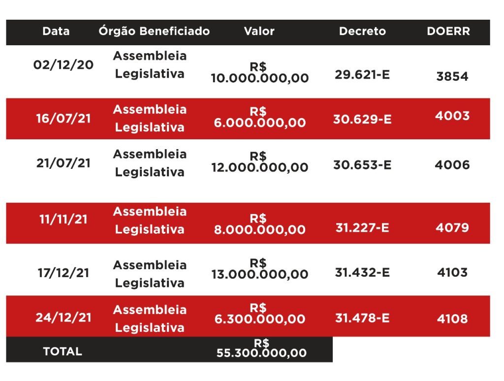 No documento ao qual a REVISTA CENARIUM teve acesso, o advogado detalha que a ALERR recebeu seis repasses de Crédito Suplementar por Excesso de Arrecadação enviados pelo Governo do Estado. O Legislativo, em Roraima, tem como presidente o Soldado Sampaio (Republicanos).