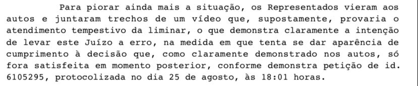 “Para piorar ainda mais a situação, os representados vieram aos autos e juntaram trechos de um vídeo que, supostamente, provaria o atendimento tempestivo da liminar, o que demonstra, claramente, a intenção de levar este juízo ao erro, na medida em que tenta se dar aparência de cumprimento à decisão que, como, claramente, demonstrado nos autos, só fora satisfeita em momento posterior, conforme demonstra petição de id. 6105295, protocolizada no dia 25 de agosto, às 18h01. Diante da ausência de comprovação tempestiva do cumprimento da ordem judicial, a imposição de multa é a medida que se impõe”, destacou o juiz.