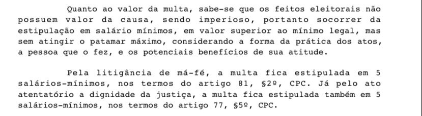 Com isso, o magistrado destaca que “Pela litigância de má-fé, a multa fica estipulada em 5 salários mínimos, nos termos do artigo 81, §2o, CPC. Já pelo ato atentatório à dignidade da Justiça, a multa fica estipulada também em 5 salários mínimos, nos termos do artigo 77, §5o, CPC”, afirma Marcelo Lima.