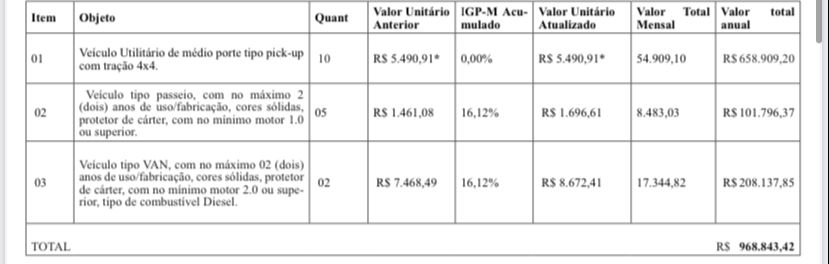 “Eventual Contratação de Empresa Especializada na Locação de Veículos, sem motorista, quilometragem livre, com manutenção preventiva e corretiva (incluindo reposição de pneus, serviços de mecânica e peças) sob a responsabilidade da contratada, incluindo seguros e demais despesas necessárias para prestação dos serviços”, que visa atender a Casa Civil, em cumprimento ao § 8º do Art. 65 da Lei nº 8.666/93”, diz trecho.