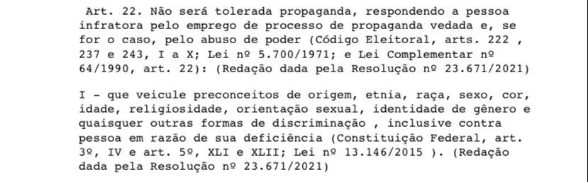 “I – que veicule preconceitos de origem, etnia, raça, sexo, cor, idade, religiosidade, orientação sexual, identidade de gênero e quaisquer outras formas de discriminação, inclusive contra pessoa em razão de sua deficiência (Constituição Federal, art. 3o, IV e art. 5o, XLI e XLII; Lei no 13.146/2015 ). (Redação dada pela Resolução no 23.671/2021)”, afirma o magistrado em um dos trechos.