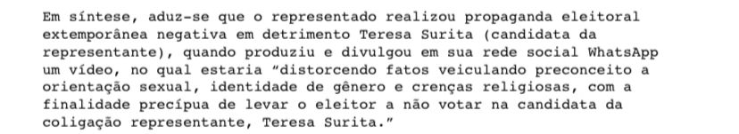 De acordo com advogados da coligação “Roraima muito melhor”, que ingressaram com a ação, Marcos Eraldo Marques promove de forma escancarada preconceito à orientação sexual e identidade de gênero em afronta ao que determina o art. 22, I, da Resolução TSE n.o 23610/2019, e ataca a honra da pré-candidata Teresa Surita quando, por meio da rede social Twitter, insinua que a mesma seria o ‘anticristo’.
