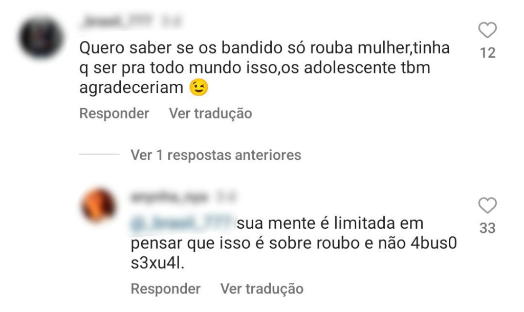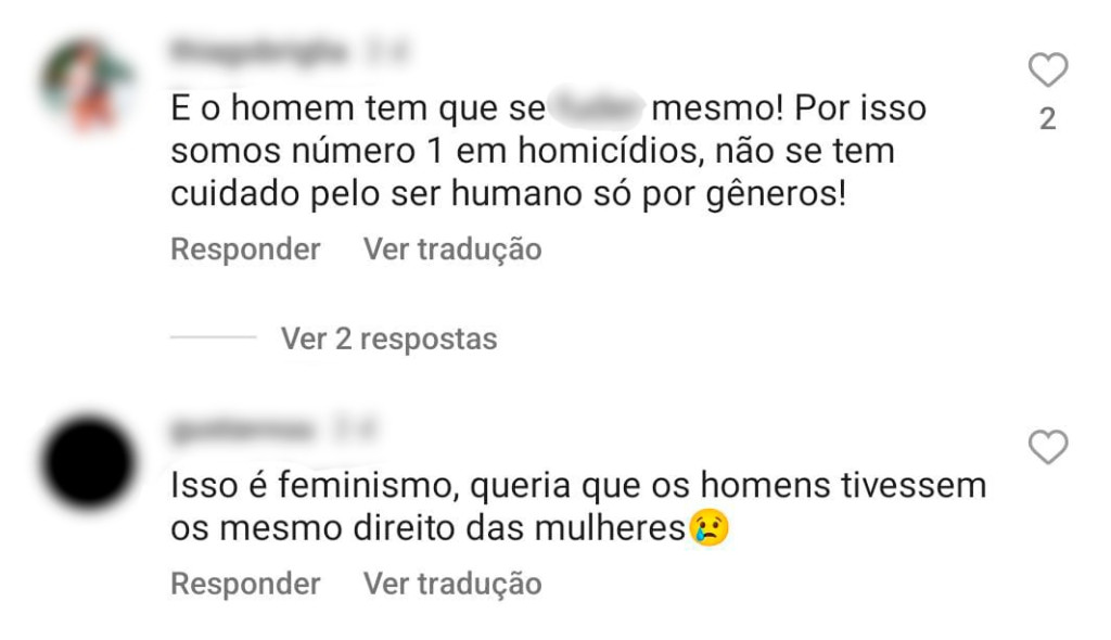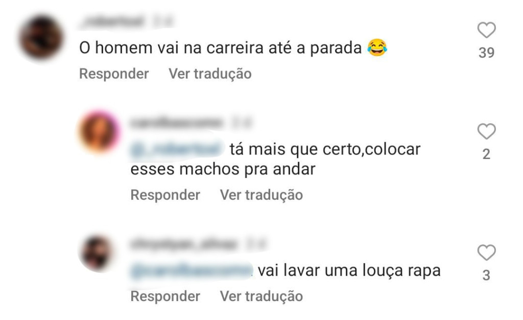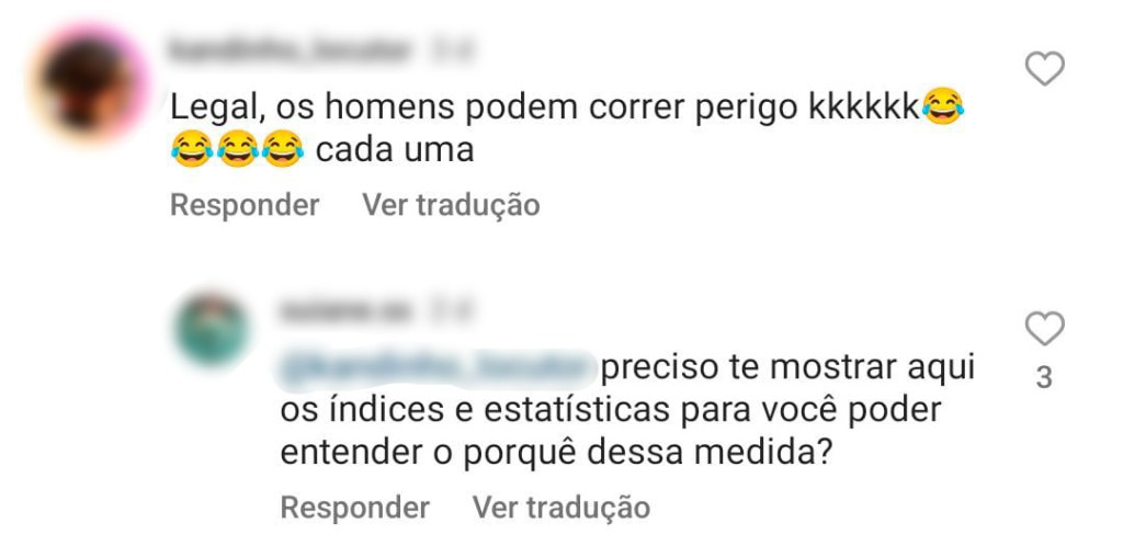 Uma internauta ainda tenta justificar: “Preciso te mostrar aqui os índices e estatísticas para você entender o porquê dessa medida?”. Em outros comentários, o sexismo fica ainda mais evidente: “O homem vai na ‘carreira’ até a parada”, ao retrucar a fala, uma mulher recebe a resposta “vai lavar uma louça, ‘rapa’”.