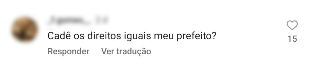 Nos comentários da postagem, enquanto alguns comentários parabenizam o gestor pela medida, outros se demonstram injustiçados. “Isso que é feminismo, queria que os homens tivessem os mesmo direito das mulheres”, “e os direitos iguais, meu prefeito?”, comentam dois homens. Outro escreve “Legal, os homens podem correr perigo kkkkkk… Cada uma”.