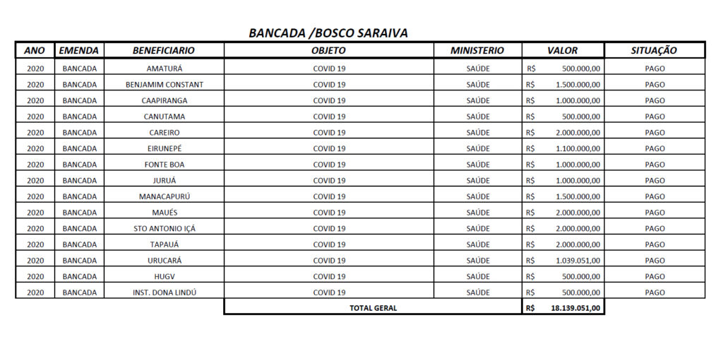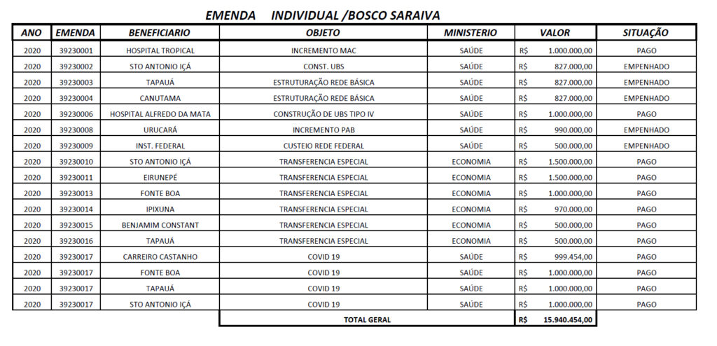 MANAUS – O deputado federal Bosco Saraiva (SD-AM) destinou R$ 34 milhões em emendas parlamentares para 14 municípios do interior do Amazonas e para a capital, Manaus, no período de fevereiro a dezembro de 2020, sendo a maioria relacionada à melhoria do atendimento hospitalar. Os dados são da Câmara Federal atualizados nesta quinta-feira, 13.