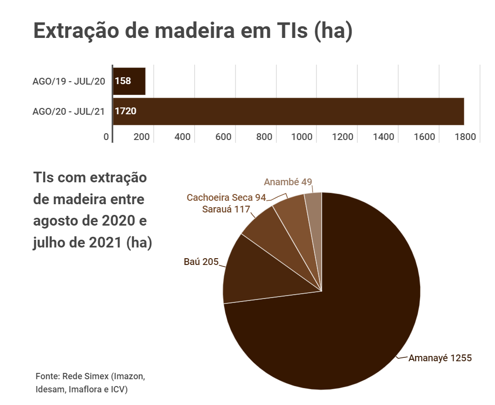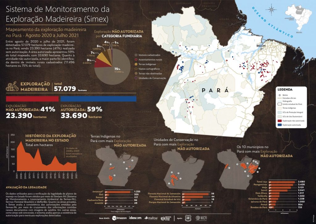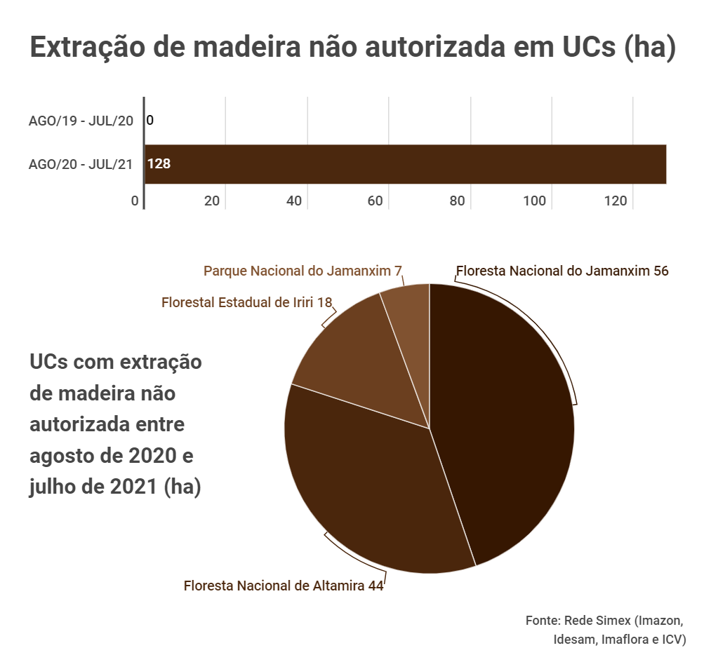 O estudo também revela que exploração ilegal de madeira em unidades de conservação, entre agosto de 2020 e julho de 2021, no entanto, foram encontrados 126 hectares com exploração madeireira não autorizada em unidades de conservação do Pará. Na publicação anterior, não foi encontrado registros da atividade irregular em áreas acima de 1 hectare — tamanho a partir do qual a Rede Simex mapeia a extração de madeira.