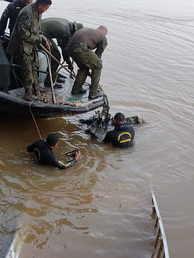 De acordo com a Secretaria de Segurança Pública do Amazonas (SSP-AM), a lancha estava a cerca de 20 metros de profundidade, emborcada com seis sacos de areia para dificultar a flutuação e a uma distância de 20 metros da margem direita do rio. Em imagens compartilhadas pela pasta, é possível observar o momento em que a embarcação é localizada.