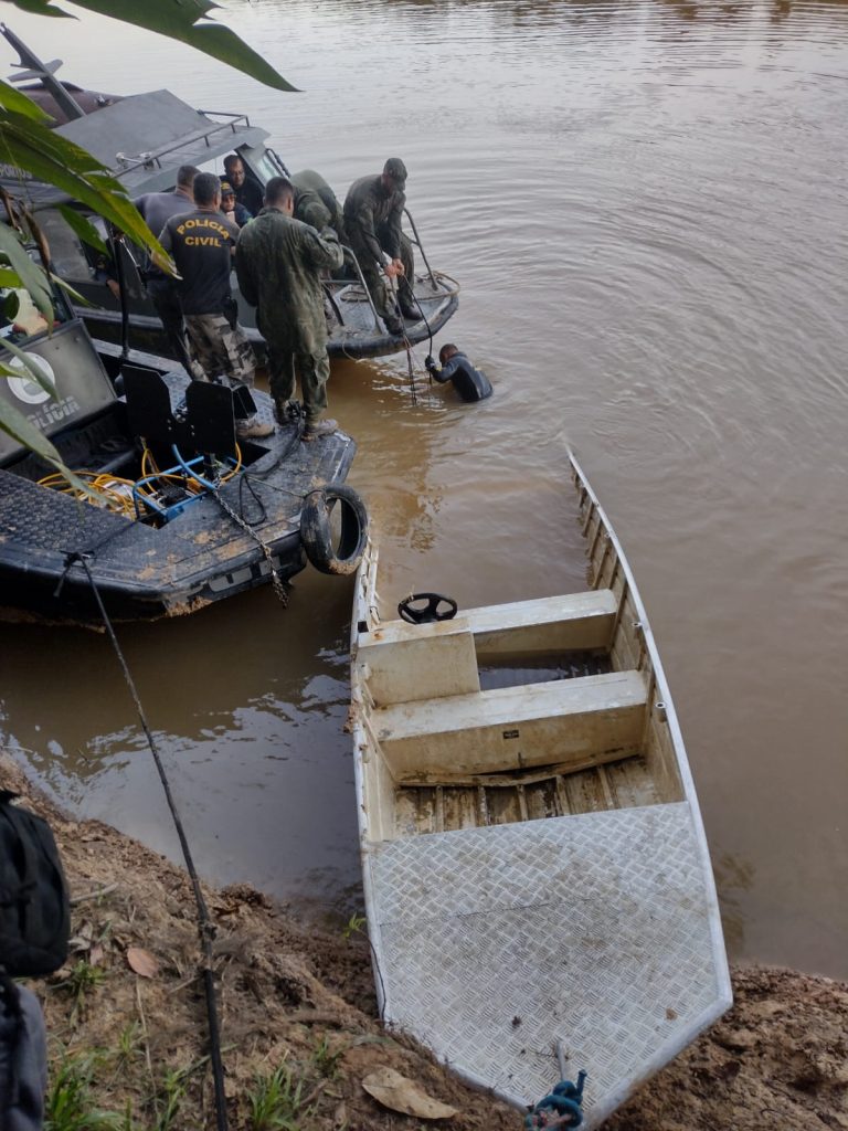 O delegado Alex Perez, titular da 50ª Delegacia Interativa de Polícia (DIP) de Atalaia do Norte, explicou que foram quase cinco horas de operação até a equipe de buscas achar a embarcação. A polícia informou, ainda, que também foram encontrados um motor Yamaha 40 hp e quatro tambores de combustível, três em terra firme e um submerso, que eram de propriedade do Bruno.
