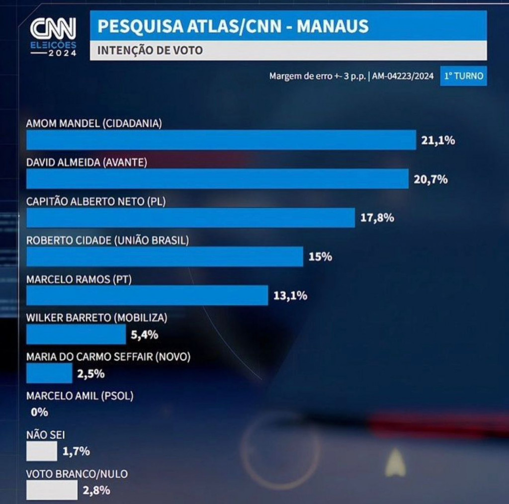 No estudo, Amom Mandel aparece com 21,1%, David Almeida com 20,7%, Alberto Neto chega a 17,8% e Roberto Cidade com 15%. A margem de erro da pesquisa é de três pontos percentuais, para mais ou para menos.