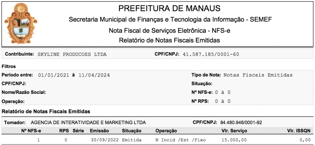 O Radar Amazônico também descobriu que Izabelle abriu a Skyline Produções Ltda. em abril de 2021, quatro meses após David Almeida tomar posse como prefeito de Manaus.