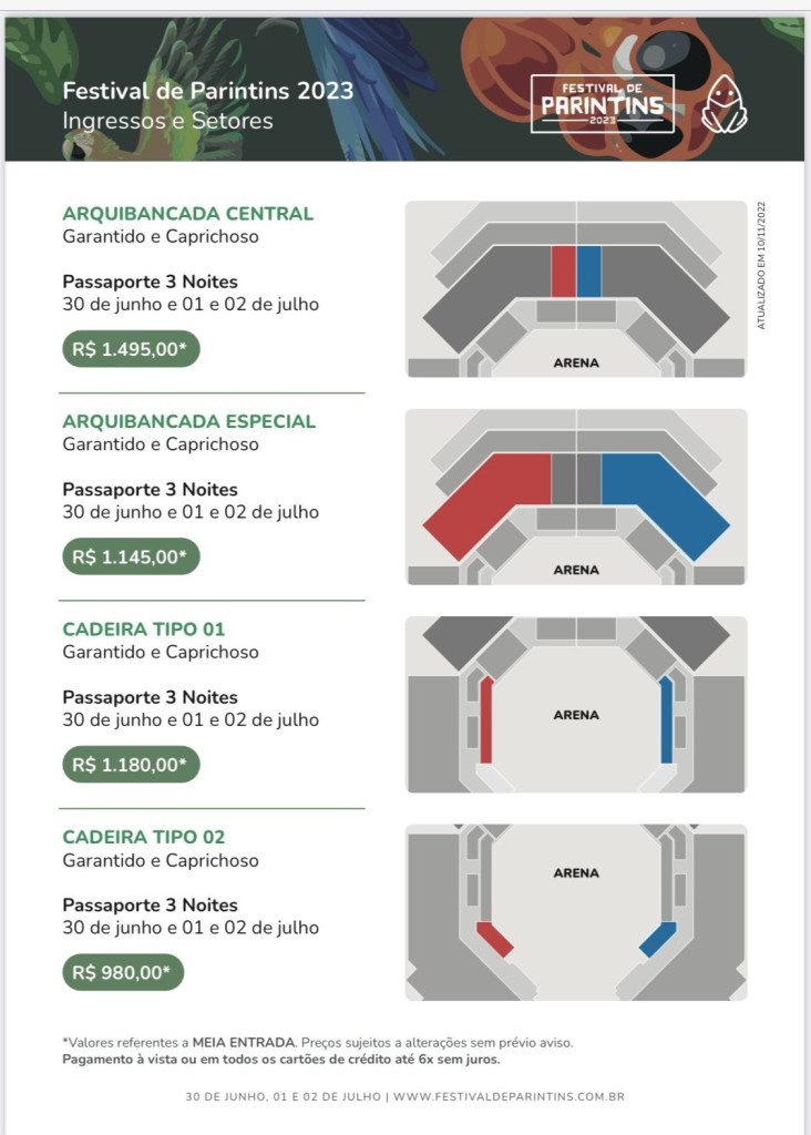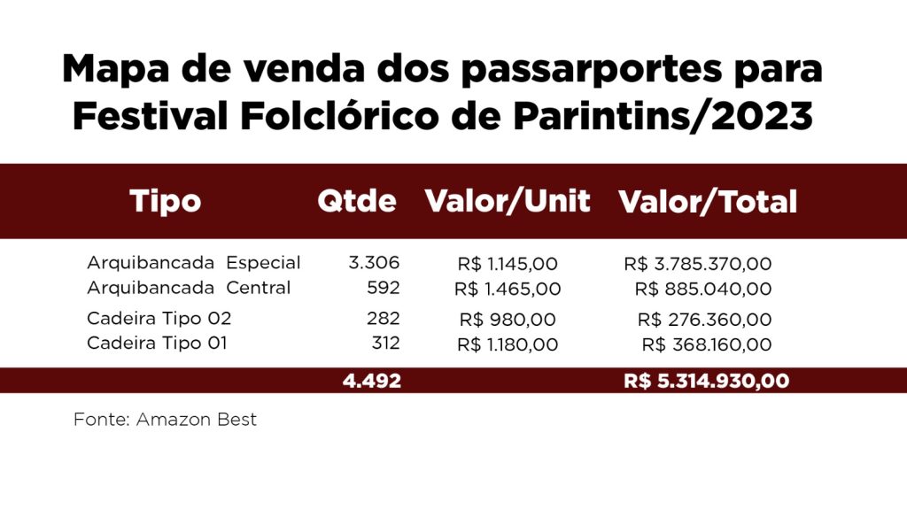 Já 312 passaportes para a “cadeira tipo 1” possuem o valor unitário de R$ 1.180 que, juntos, fazem R$ 368.160. Se todos os ingressos forem vendidos – como ocorre todo o ano – a Amazon Best fatura um total de R$ 5.314.930. A situação dos outros 15.508 lugares do bumbódromo não foi explicada pela empresa nem pela Prefeitura de Parintins.