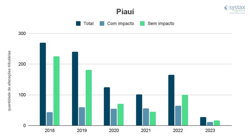 De acordo com os dados da Systax, o Piauí registrou, em 2021, 101 alterações, sendo 56 com impacto e 45 sem impacto. Em 2022, o Estado registrou 165 mudanças, com 65 tendo impacto e 100 sem impacto. Em 2023, até o momento, o número de alterações tributárias chega a 28, sendo 11 com impacto e 17 sem impacto.