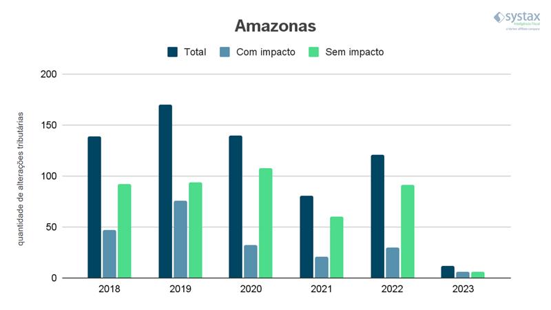 Já no Amazonas, a movimentação tributária é influenciada pela Zona Franca de Manaus, que oferece incentivos fiscais para as empresas que se instalarem na região. Segundo a Systax, o Estado registrou 81 alterações em 2021, sendo 21 com impacto e 60 sem impacto. Em 2022, o Estado registrou 121 mudanças, com 30 tendo impacto e 91 sem impacto. Neste ano, o número se encontra em 12 alterações tributárias, com 6 tendo impacto e 6 sem impacto.