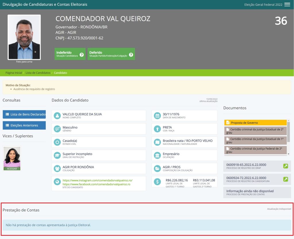 Ainda de acordo com os dados da plataforma de Divulgação de Candidaturas e Contas Eleitorais, vinculada ao Tribunal Superior Eleitoral (TSE), Valclei Queiroz também não prestou contas relacionadas à atual disputa.