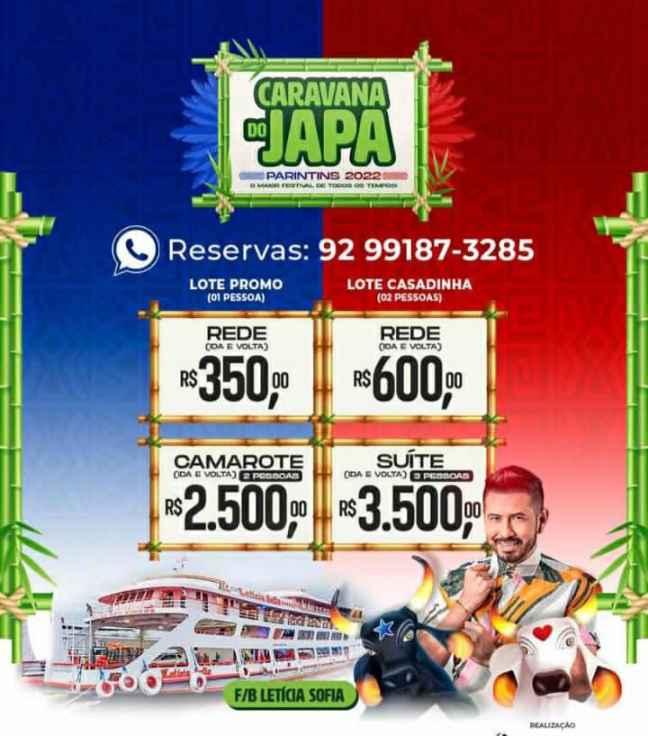 For river trips, i.e. through the Amazon rivers, prices are cheaper. The values, however, vary from R$ 350 (round trip), leaving Manaus to Parintins, for those who travel in boats with traditional nets. The Caravana do Japa, for example, offers a promotion for two people for R$ 600. Reservations can be made through the number (92) 99187-3285.