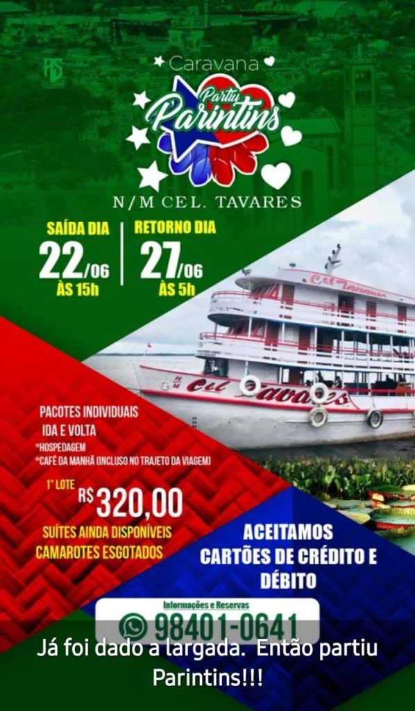 In Caravan Partiu Parintins, the individual tickets are worth from R$ 320 round trip, and the departure scheduled for the day 22 and return day 27 June. Reservations can be made through the number (92) 98401-0641.