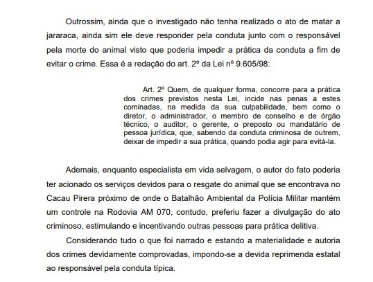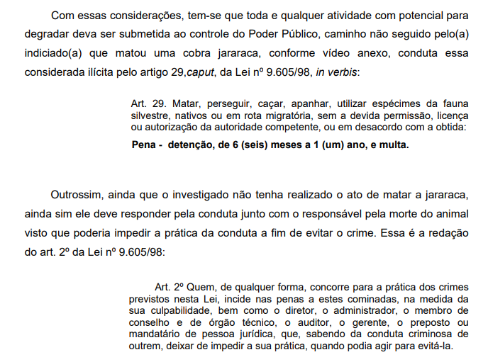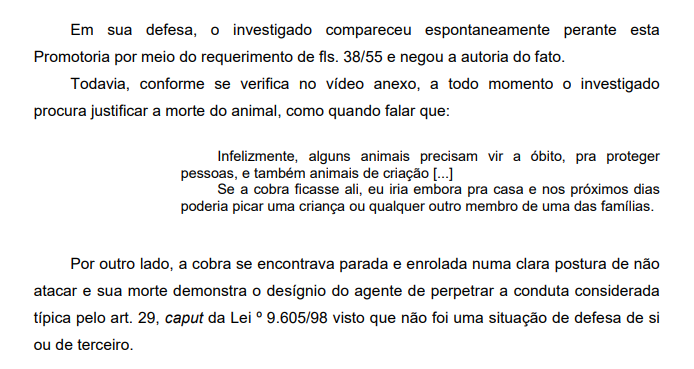 In the report of the MP, signed by the prosecutor Francisco de Assis Aires Argüelles, the text points out that the snake was stationary and coiled in “clear posture of not attacking”, ie, the attitude was not taken for self-defense or third parties, which is a crime.