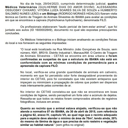 On April 29, four veterinarians and a biologist were accompanying the Commission for the Protection of Animals of the Legislative Assembly of the State of Amazonas (Aleam) and State Representative Joana Darc to the Wild Animal Sorting Center (Cetas), of the Brazilian Institute of Environment and Renewable Natural Resources (Ibama), to investigate the conditions in which the capybara Filó was housed.