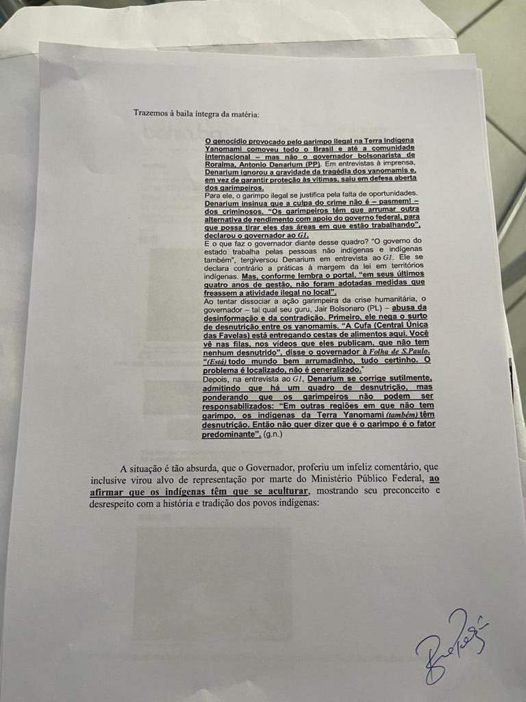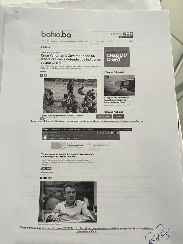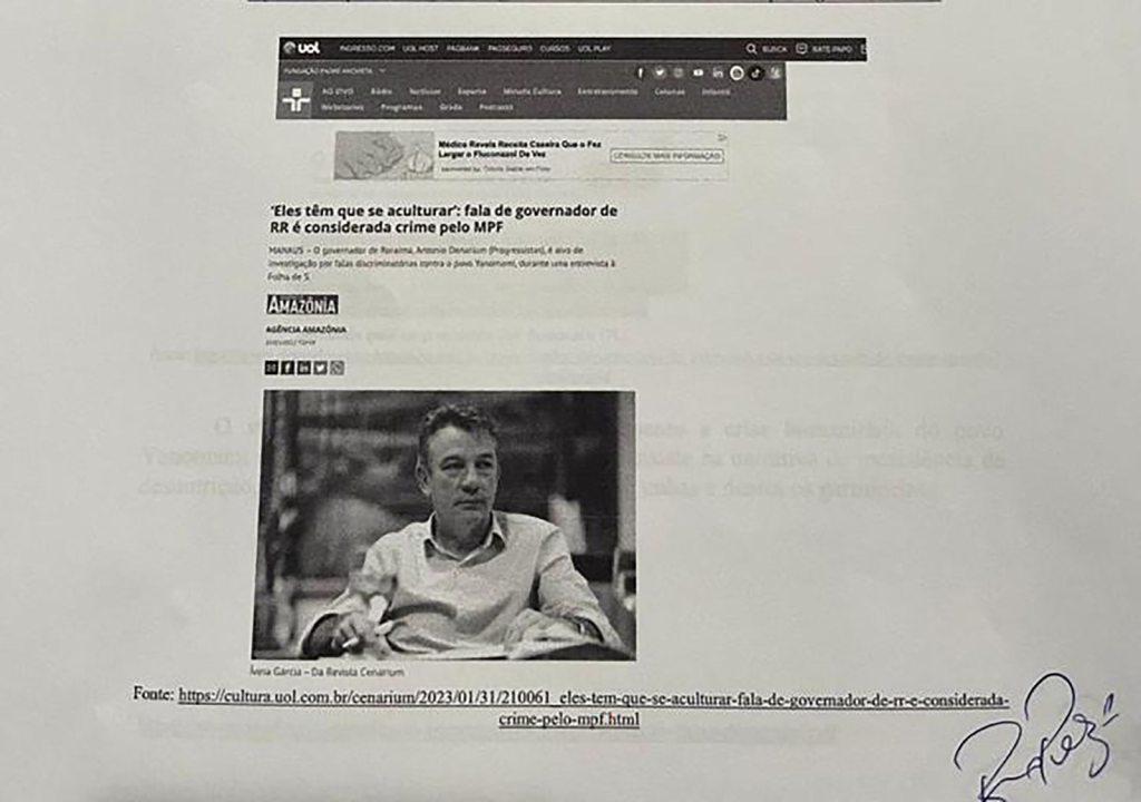 On January 31, the journalist Ívina Garcia published that the governor of Roraima, Antonio Denarium (PP), is the target of investigation for discriminatory statements against the Yanomami people during an interview with Folha de S.Paulo.