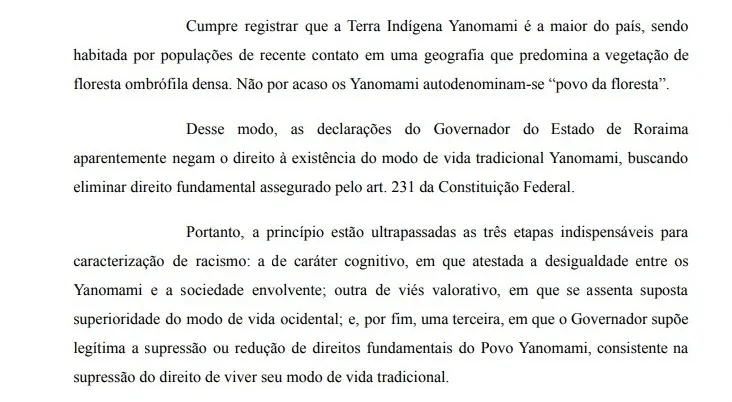 According to the Federal Public Ministry (MPF), during the interview with Folha, on January 29, Denarium belittled the culture and way of life of the Yanomami people when he said that “they [indigenous people] have to become acculturated, they can no longer stay in the middle of the forest, looking like animals. The speech was considered to be unlawful conduct subject to civil and criminal liability.