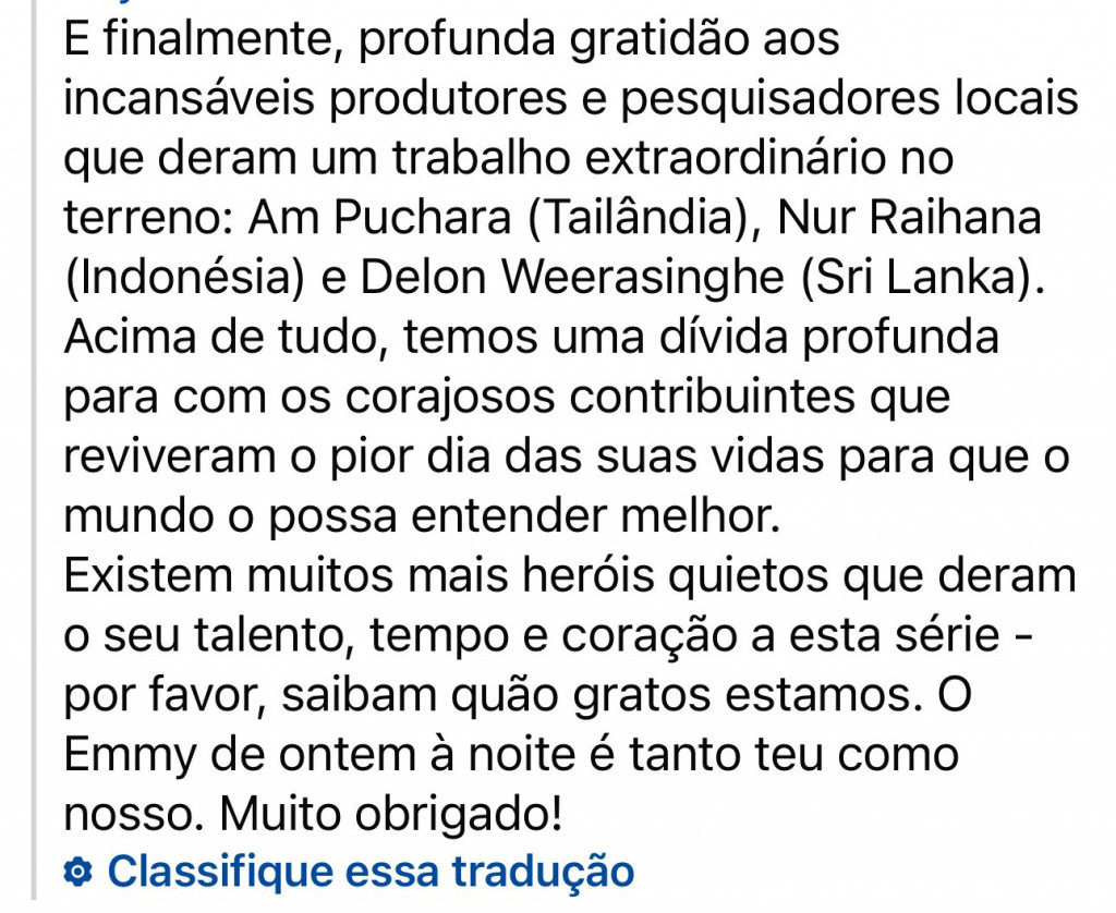 “Above all, we owe a deep debt to the courageous contributors who relived the worst day of their lives so that the world could better understand it. There are many more quiet heroes who gave their talent, time, and heart to this series. Please know how grateful we are. Last night’s Emmy is as much yours as it is ours. Thank you so much!” he concluded, in free translation.