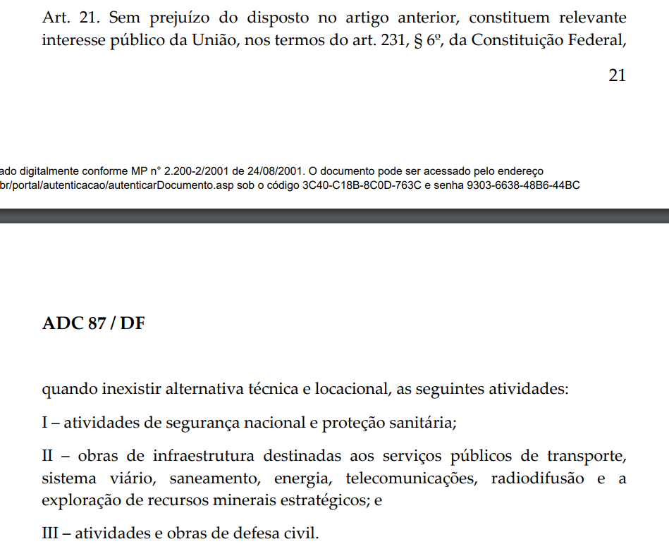 Article 21 of the draft proposal, in the section dealing with the use and management of Indigenous Territories, opens the possibility for mining within indigenous territories. The measure states that the exploitation of mineral resources would be subject to the “significant public interest of the Union.” Currently, the Federal Constitution prohibits this practice within Indigenous Territories. See an excerpt from the draft:
