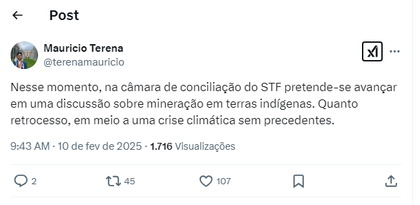 “At this moment, in the STF conciliation chamber, there is an attempt to advance a discussion on mining in indigenous territories. What a setback, in the midst of an unprecedented climate crisis,” wrote the Apib legal coordinator on social media. See: