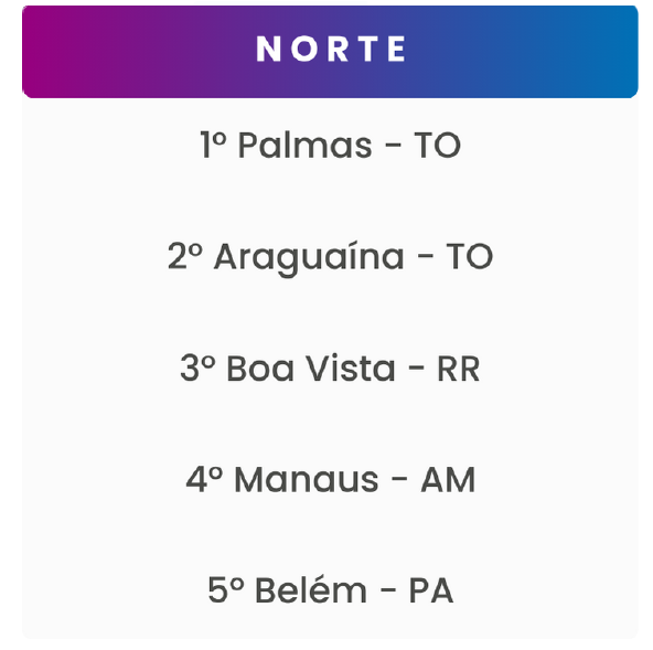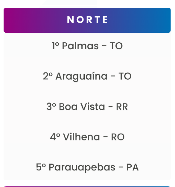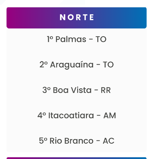 In 2023, Palmas, Araguaína, and Boa Vista also occupied the first, second, and third places, respectively, but this time, they were followed by Vilhena (RO) and Parauapebas (PA).