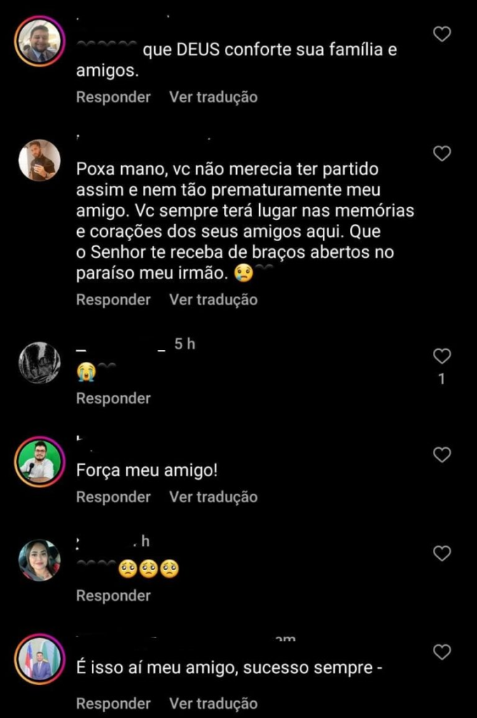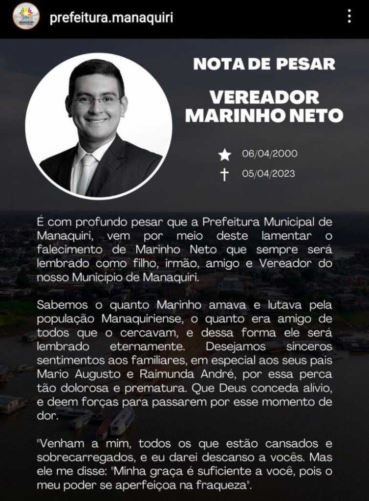 In a note, the Manaquiri City Hall regretted the early death of the councilman. In social networks, the administration of the municipality stressed the love of the young councilman for his hometown. “(…) We know how much Marinho loved and fought for the Manaquiriense population, how he was a friend to all who surrounded him, and thus, he will be remembered forever. We wish sincere condolences to the family, especially to his parents, Mario Augusto and Raimunda André, for such a painful and premature loss,” said the mayor.