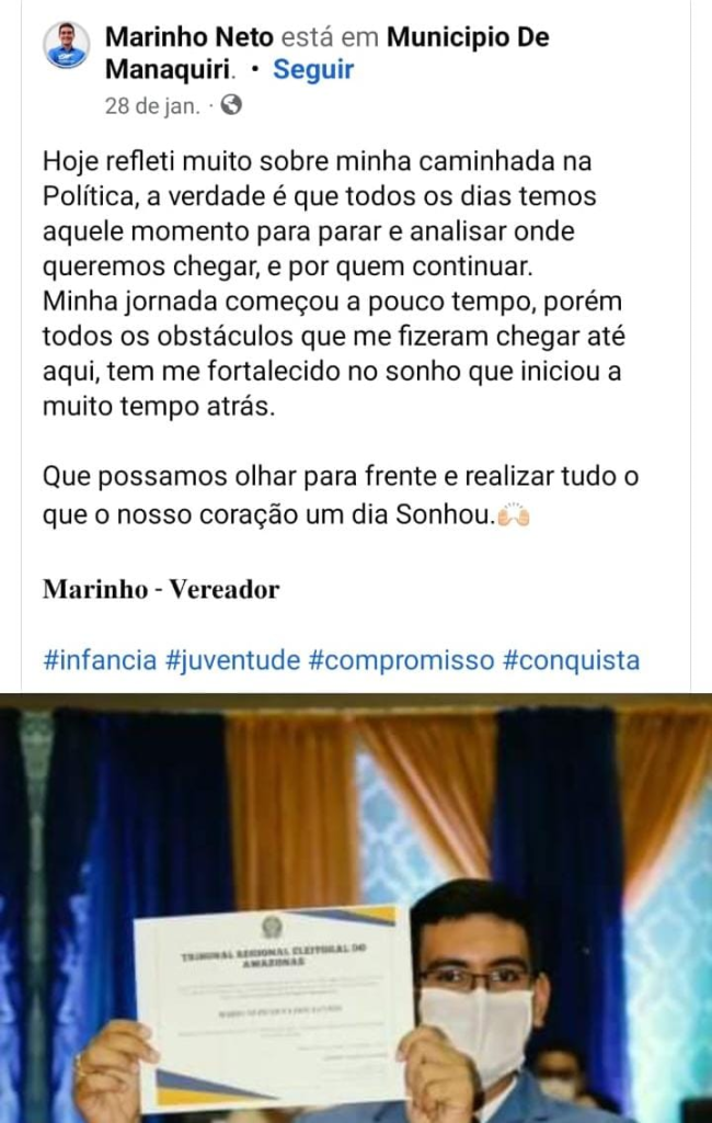 Born in Manaquiri, Marinho Neto became one of the youngest politicians in the history of the state of Amazonas. At the age of 20, Marinho was elected as a city councilman in the 2020 elections. The parliamentarian obtained 255 votes. Soon after the election of, then, councilman Amom Mandel (Citizenship), to the position of federal deputy, Marinho Neto was the youngest councilman in Amazonas.