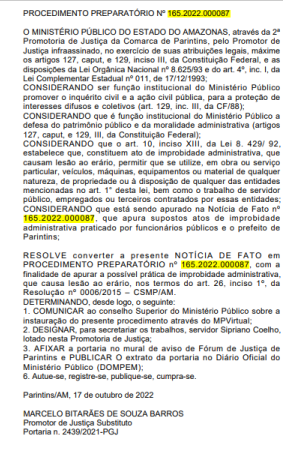 Other actions determined by the prosecutor were: communicate the Superior Council of the MP about the instauration procedure; designate the server Sipriano Coelho, stationed in the Prosecutor’s Office of Parintins, to lead the work; affix the ordinance on the notice wall of the Forum of Justice of Parintins; and publish the extract of the ordinance in the Official Journal of the Public Ministry.