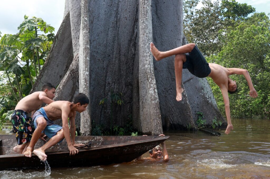 However, it is not only in the backyard of the house that there is fun. Children and teenagers navigate the city in search of adventures. Next to century-old sumaúma, which can be seen from various city’s points, they have fun. There, young people make the party in jumps and dives to make an Olympic athlete envy. In another part of the city, kids transform a wooden construction into a springboard to jump and enjoy the water that city consumes.