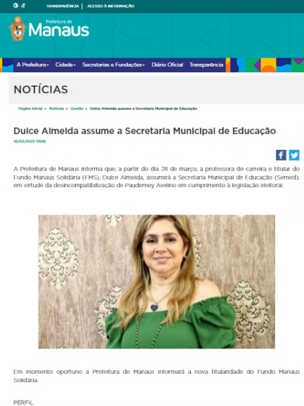 The information was confirmed by the Manaus City Hall, in a statement, through the Municipal Communication Department (Semcom) of Manaus, on Wednesday, 16. The Manaus City Hall reported that from the next day 28 this month Dulce will assume the office. Currently, Semed has as current responsible Pauderney Avelino (União Brasil).