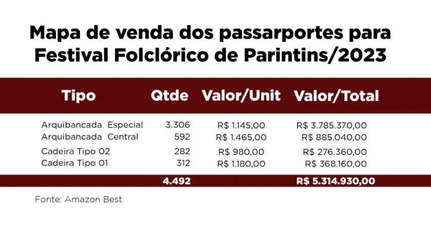 And 312 passports for the “type 1 seat” have a unit value of R$ 1,180, which together make R$ 368,160. If all tickets are sold – as happens every year – Amazon Best makes a total of R$ 5,314,930. The situation of the other 15,508 seats of the bumbódromo was not explained by the company nor by the Parintins City Hall.