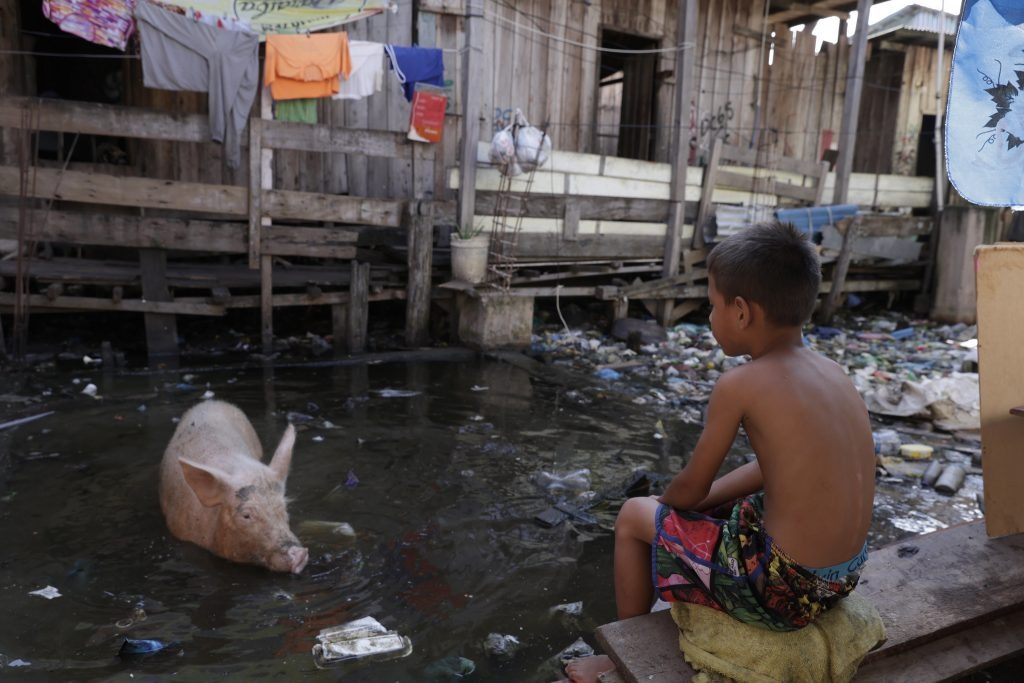 A resident of the neighborhood for over three decades, Vanderlan Rodrigues, 39, recalls the days when floods brought disease and despair. “When the water rises, it brings dead dogs, dead cats, human waste. People were always getting sick. Today, with treated water in the tap, hope has returned to us,” he says, while his son watches a pig rolling in the mud beneath the house.